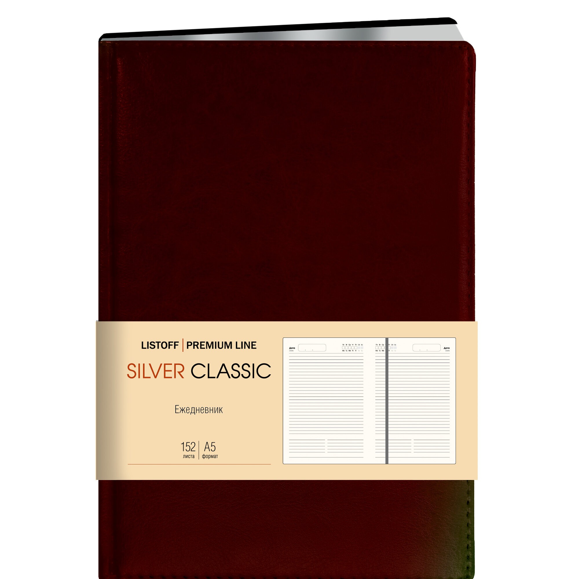 Премиальный ежедневник “Silver Classic” с недатированным внутренним блоком, А5 формата создан для тех, кто любит классику и качество! Обложка из искусственной кожи в консервативной офисной палитре изысканно подчеркнута серебряным срезом на торце. Тонированный внутренний блок (152 листа) из высококачественной бумаги включает в себя дополнительные разделы: личные данные, календарь, планирование проектов, важные даты, контакты, заметки. Строгая закладка-ляссе поможет с легкостью найти важные записи.