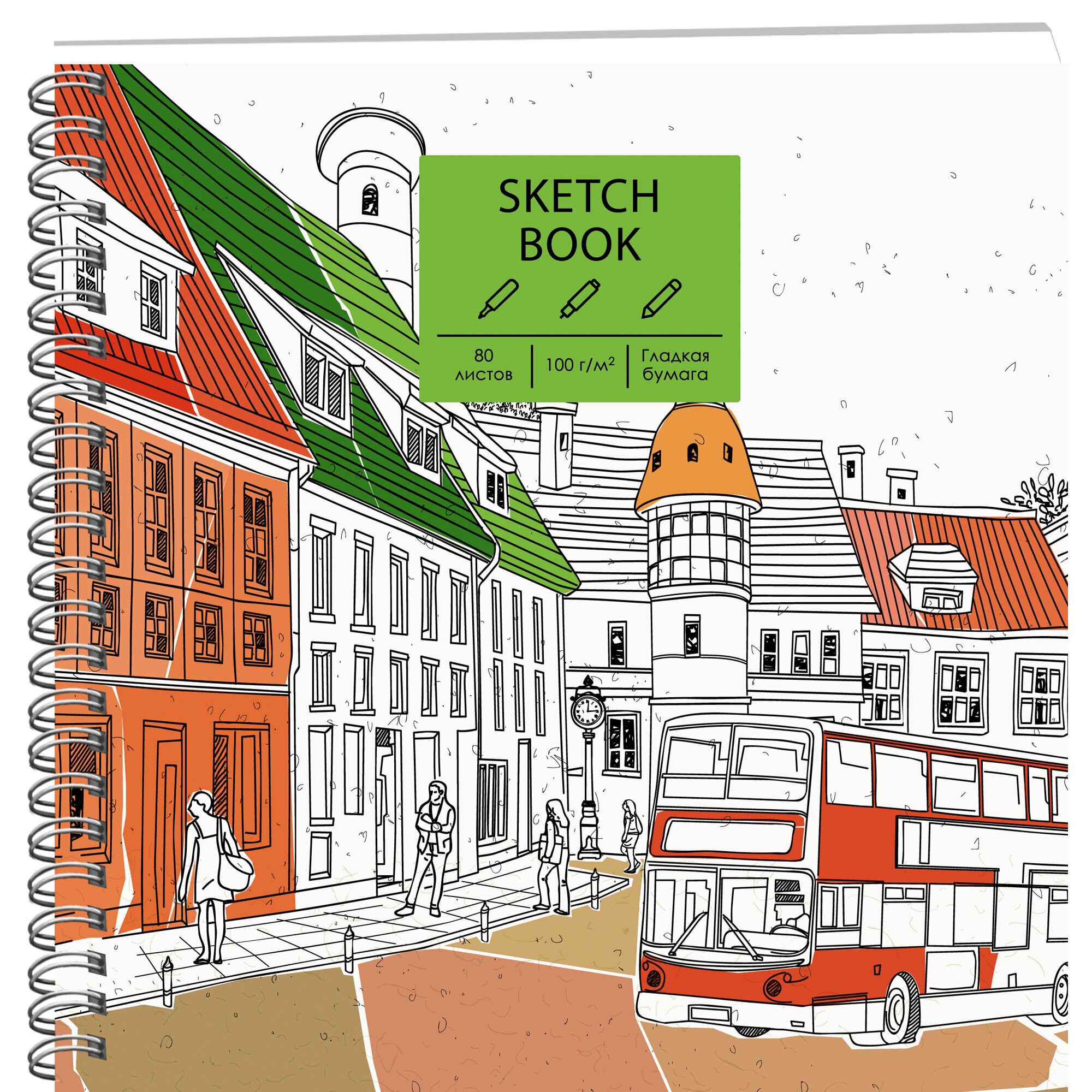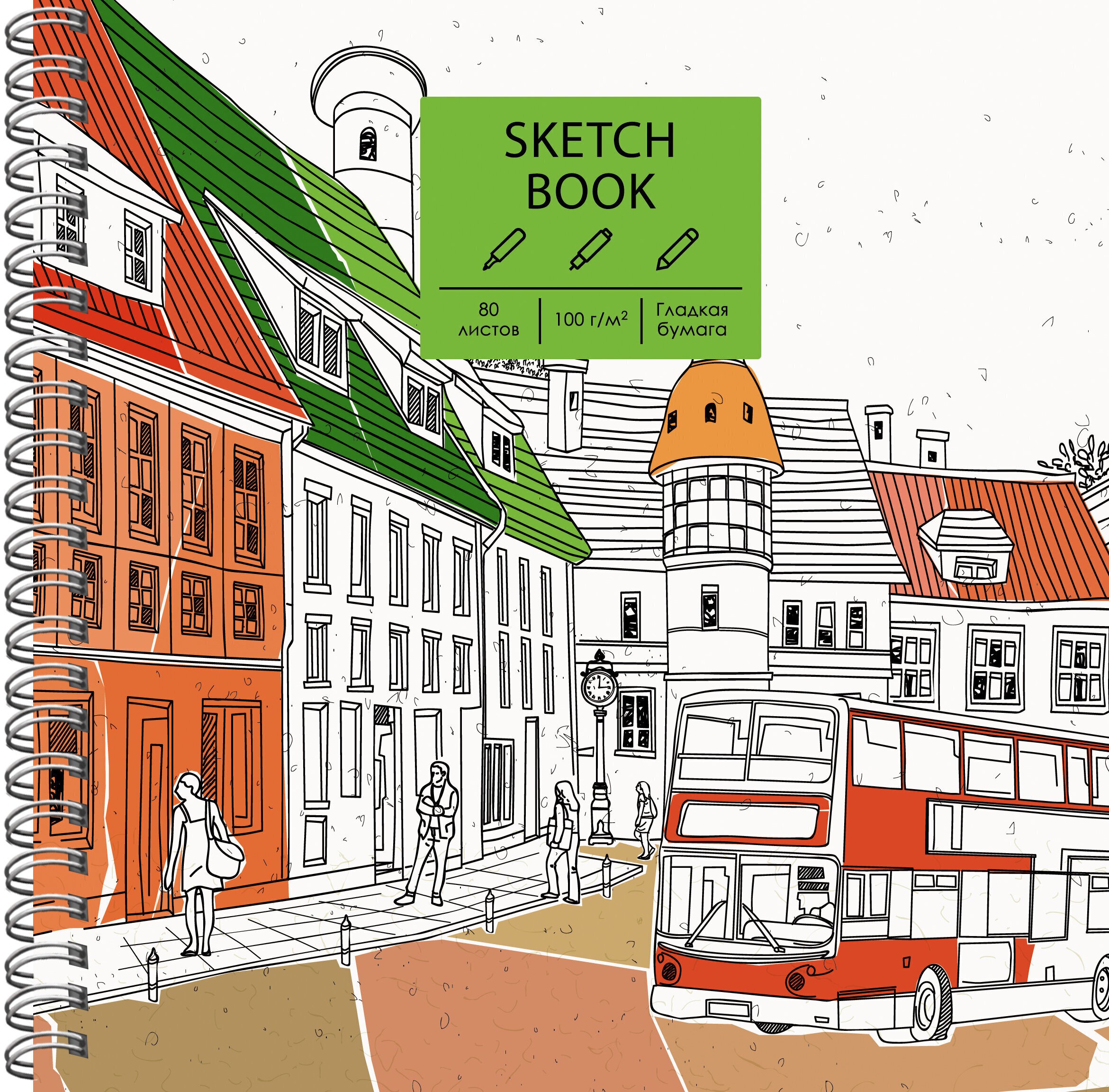 Скетчбук квадратного формата (195х195 мм) с евроспиралью станет удобным инструментом для обладателей творческих талантов. Внутренний блок состоит из 80 листов бумаги плотностью 100г/м2, которая подходит для ежедневных зарисовок карандашами, линерами, ручками, не спиртовыми маркерами, а также – для коллажирования.